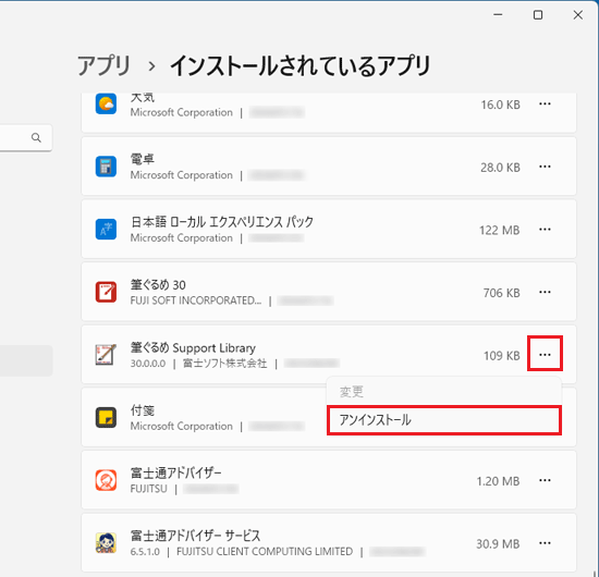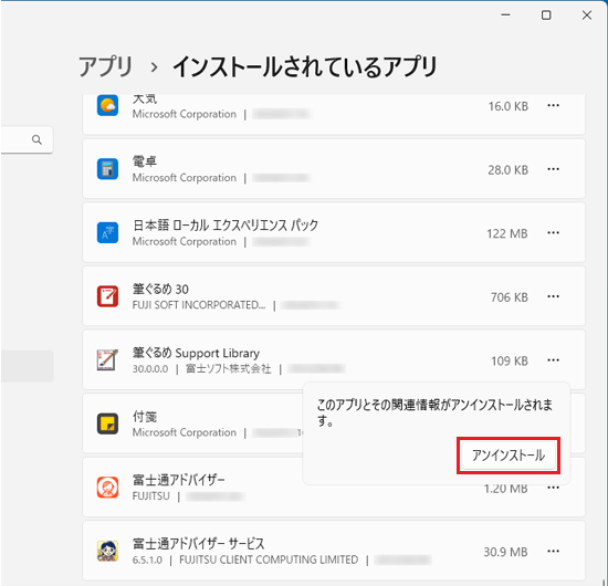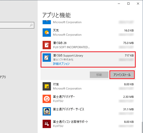 「アプリと機能」の一覧から筆ぐるめ Support Libraryをアンインストールします。