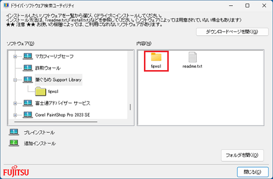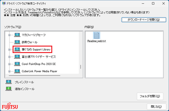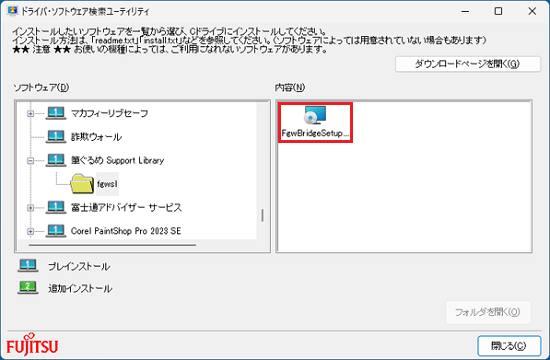 「ドライバ・ソフトウェア検索ユーティリティ」から、筆ぐるめ Support Libraryをインストールします。
