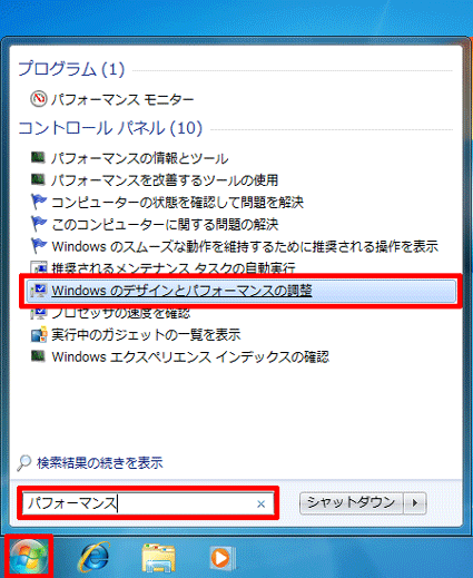 - スタートメニューの検索ボックスに「パフォーマンス」と入力し、検索結果から「Windowsのデザインとパフォーマンスの調整」をクリックします。