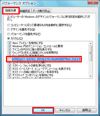 「視覚効果」タブをクリックし、「ウィンドウを最大化や最小化するときにアニメーションで表示する」をクリックしチェックを外したら、「OK」ボタンをクリックします。