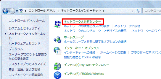 表示方法が「大きいアイコン」または「小さいアイコン」の場合は、「ネットワークと共有センター」アイコンをクリックし、手順7.へ進みます。 - 「ネットワークと共有センター」をクリックします。