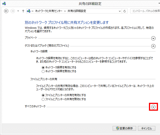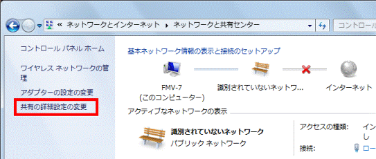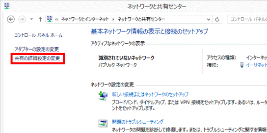 無線で接続している場合は、「アクティブなネットワークの表示」の右側にSSIDが表示されます。 - 「共有の詳細設定」が表示されます。