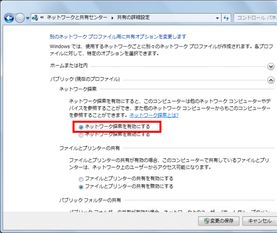 「パブリック(現在のプロファイル)」の「ネットワーク探索を有効にする」をクリックします。