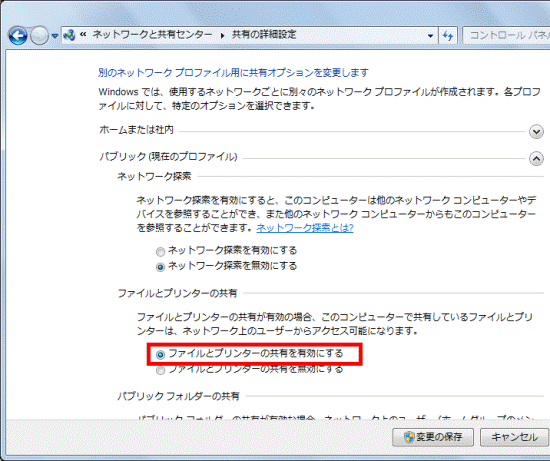 - 「ファイルとプリンターの共有を有効にする」をクリックします。