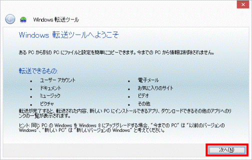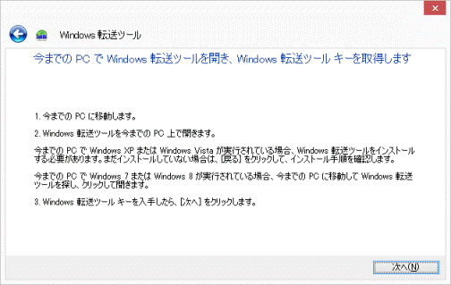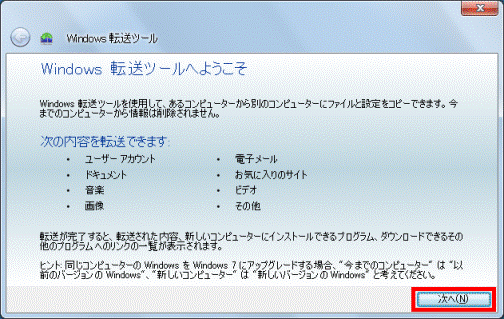 - 「Windows 転送ツールへようこそ」と表示されます。
