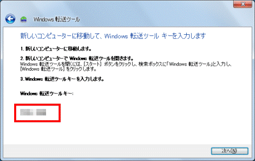 - 「新しいコンピューターに移動して、Windows 転送ツールキーを入力します」と表示されます。