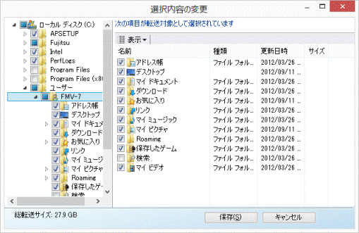 表示された選択項目の下部にある「詳細設定」をクリックすると、「設定内容の変更」が表示され、移行するデータを細かく選ぶことができます。