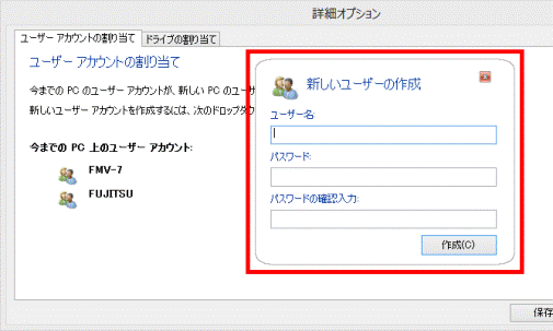 「新しいPC上のユーザーアカウント」の「▼」ボタンをクリックし、表示されるメニューから「ユーザーの作成」をクリックすると、「新しいユーザーの作成」が表示されます。