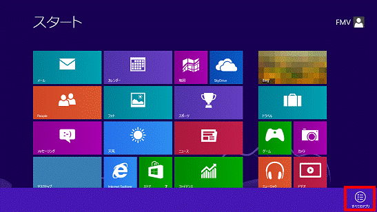 - スタート画面の何もないところを右クリックし、画面右下に表示される「すべてのアプリ」をクリックします。