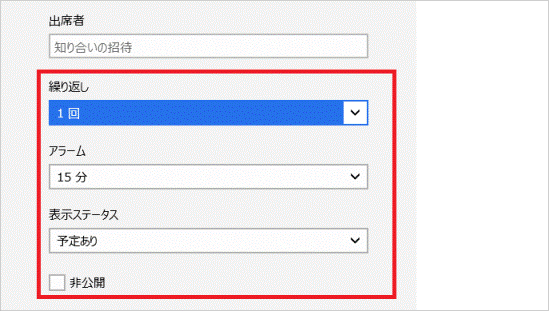 「詳細を表示」をクリックすると、繰り返しやアラームなどの設定項目が表示されます。