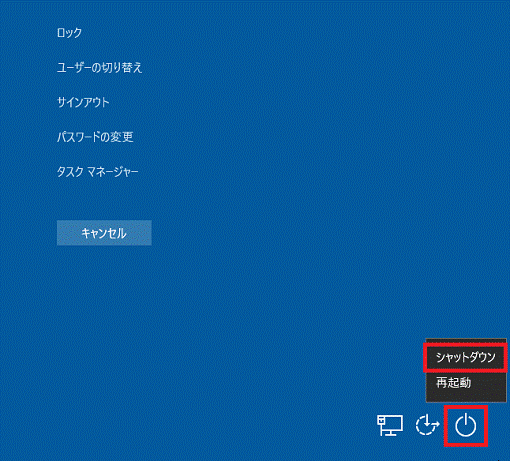 画面右下の電源ボタンのマークをクリックし、表示されるメニューから「シャットダウン」をクリックします。