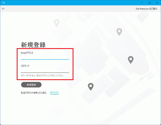 Tile アカウントとして登録するメールアドレスとパスワードを入力します。