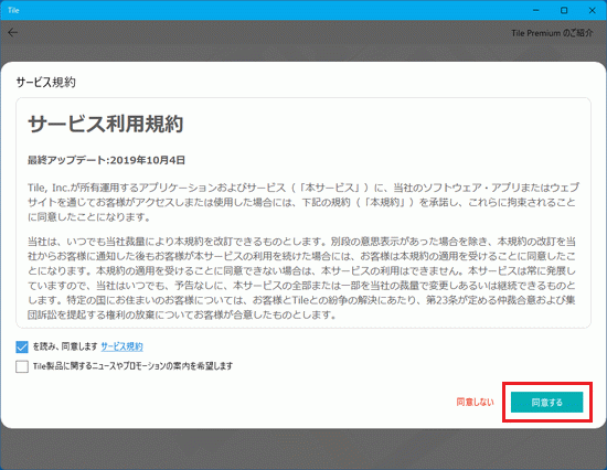 アドバイス「Tile製品に関するニュースやプロモーションの案内を希望します」は、お好みに応じてチェックを入れます。