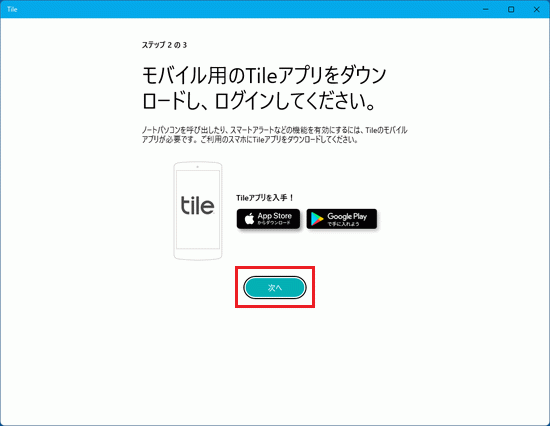 - 「モバイル用のTileアプリをダウンロードし、ログインしてください。」と表示されます。