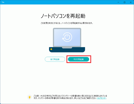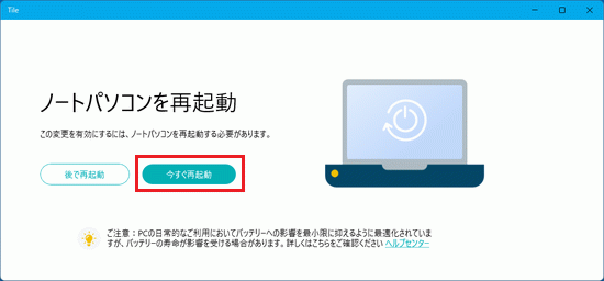 - 解除後に、再度Tile機能をお使いになるには、パソコンのTileアプリで「ノートパソコンでTile を起動します」をクリックします。