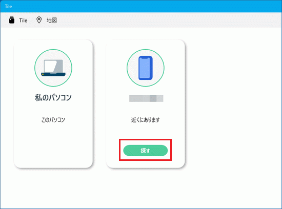「スタート」ボタン→「すべてのアプリ」→「Tile」の順にクリックします。- 探したいスマートフォンの「探す」ボタンをクリックします。