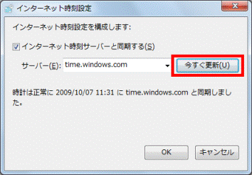 - 「時計は正常に(同期した日時)に(同期したインターネット時刻サーバー名)と同期しました。」と表示されたことを確認します。