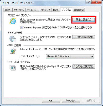 「既定に設定」ボタンがクリックできない状態の場合は、すでに Internet Explorerが通常使うブラウザーに設定されています。