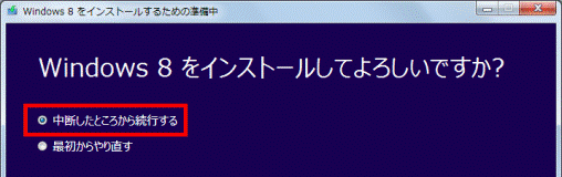 - 「Windows 8 をインストールしてよろしいですか?」と表示された場合は、「中断したところから続行する」をクリックし、「次へ」ボタンをクリックします。