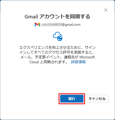 メールアカウントのパスワードを入力し、「続行」ボタンをクリックします。