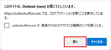 表示された画面によっては、アクセスを許可する情報にチェックを付けてから「続行」ボタンなどをクリックする必要があります。 - サインインが完了し、「このサイトは、Outlook (new) を開こうとしています。」と表示された場合は、「開く」ボタンをクリックします。