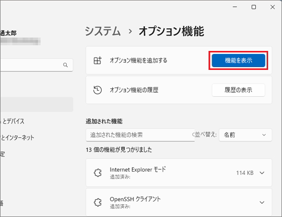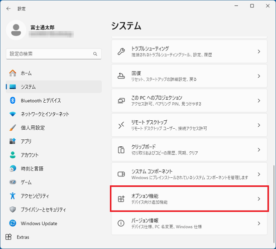 - 画面を下にスクロールし、「オプション機能」をクリックします。