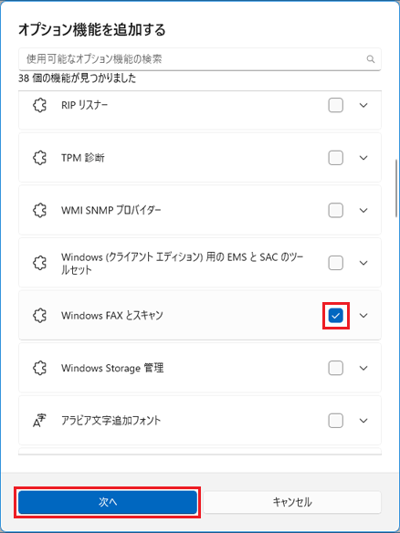 - 表示された一覧から「Windows FAXとスキャン」をクリックしてチェックを入れ、「次へ」ボタンをクリックします。