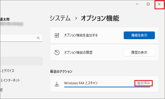 - Windows FAXとスキャンの右側に「追加済み」と表示されたことを確認し、「×」ボタンで「設定」を閉じます。