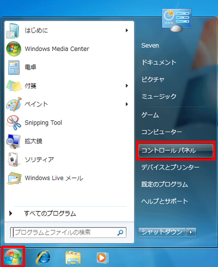 - 「スタート」ボタン→「コントロールパネル」の順にクリックします。