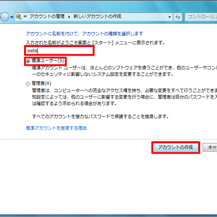 - 「標準ユーザー」をクリックして、「新しいアカウント名」と表示されているボックスに、アカウント名を入力し、「アカウントの作成」ボタンをクリックします。