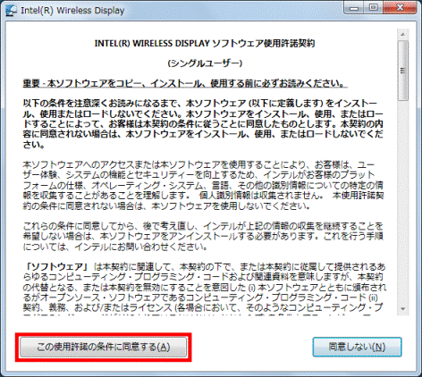 - 「INTEL(R) WIRELESS DISPLAY ソフトウェア使用許諾契約」(または「INTEL(R) WiDi ソフトウェア使用許諾契約」)と表示されます。