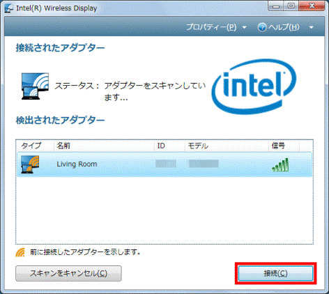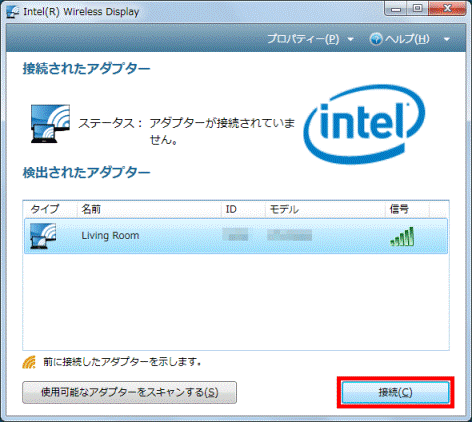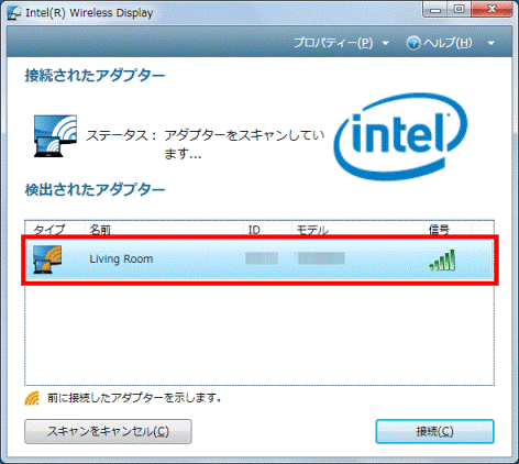 「検出されたアダプター」の項目に、お使いのインテルWiDi 受信アダプターが表示されるまで待ちます。