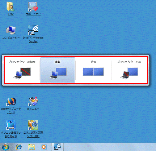 インテルWiDi について教えてください。(新しいウィンドウで表示)インテルWiDi で、テレビまたは外部ディスプレイにFMVパソコンの画面を表示する方法は、次のとおりです。