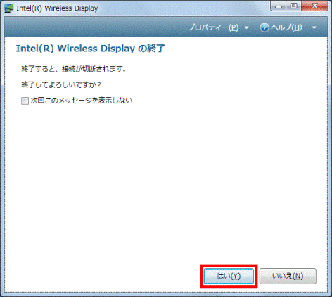 「はい」ボタンをクリックすると、インテルWiDi が終了します。