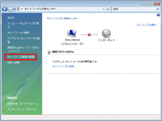 「タスク」欄の、「ネットワーク接続の管理」をクリックします。