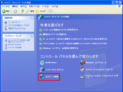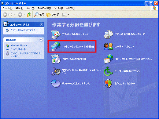 - 「コントロールパネルを選んで実行します」欄の、「ネットワーク接続」をクリックします。