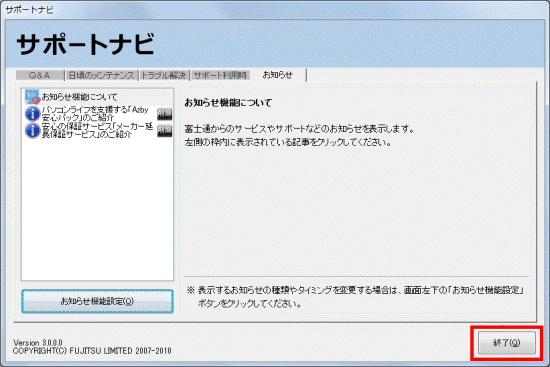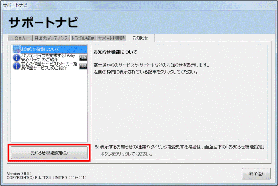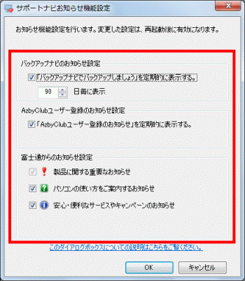 - 「サポートナビ(FMVサポートナビ)お知らせ機能設定」が表示されます。