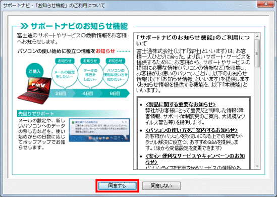 「お知らせ機能について」が表示されたら、「マイリカバリのお知らせを行わない。」をクリックしチェックを付けて、「OK」ボタンをクリックします。 - 「サポートナビ - 「お知らせ機能」のご利用について」が表示されたときは、内容をよく読み同意する場合は、「同意する」ボタンをクリックします。