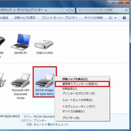 - 設定したいプリンターを右クリックし、表示されたメニューから「通常使うプリンターに設定」をクリックします。