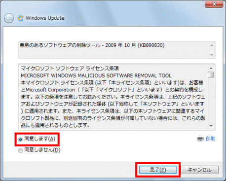 「ライセンス条項」や「使用許諾」が表示された場合は、表示された内容をよく読み、「同意します」をクリックし、「完了」(または「次へ」)ボタンをクリックします。