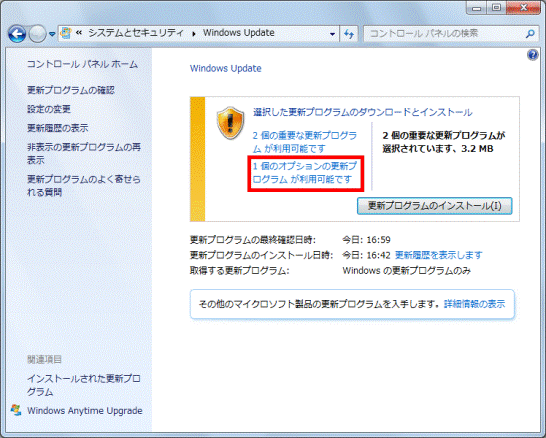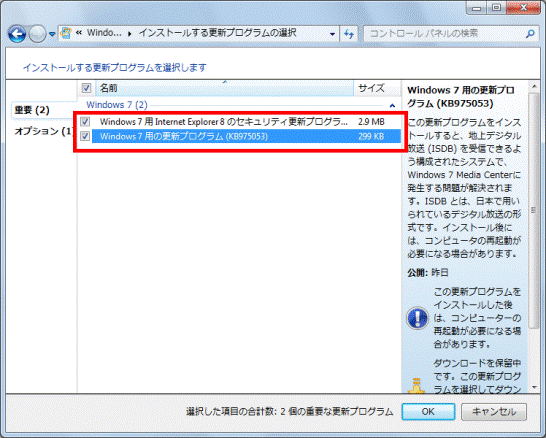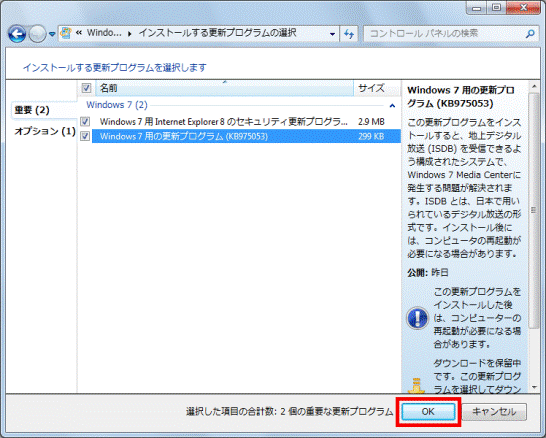 オプションの更新プログラムは、お好みでインストールしてください。 - 「OK」ボタンをクリックします。