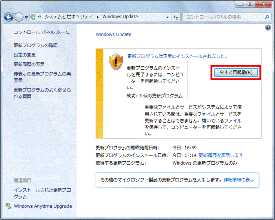「更新プログラムは正常にインストールされました。」と表示された場合は、「今すぐ再起動」ボタンをクリックします。