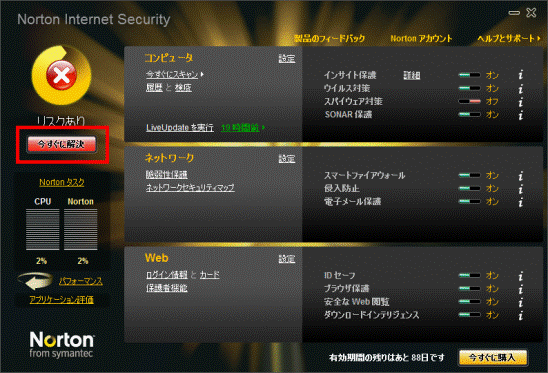 オレンジの「!」が表示されたアイコン / 赤の「×」が表示されたアイコンは、Norton Internet Security 2010のセキュリティ機能が有効に動作していません。
