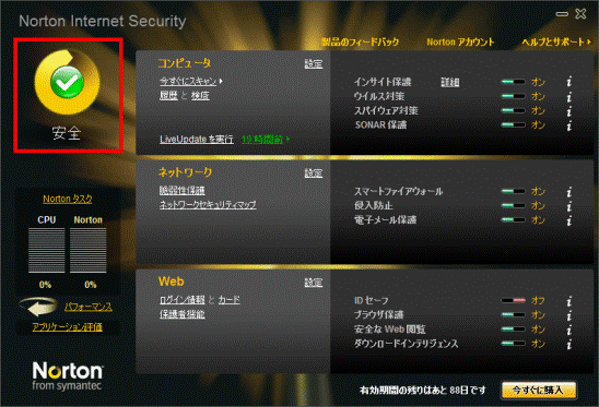 [Norton Internet Security 2010] 初期設定の方法を教えてください。(新しいウィンドウで表示)緑のチェックマークが表示されたアイコン