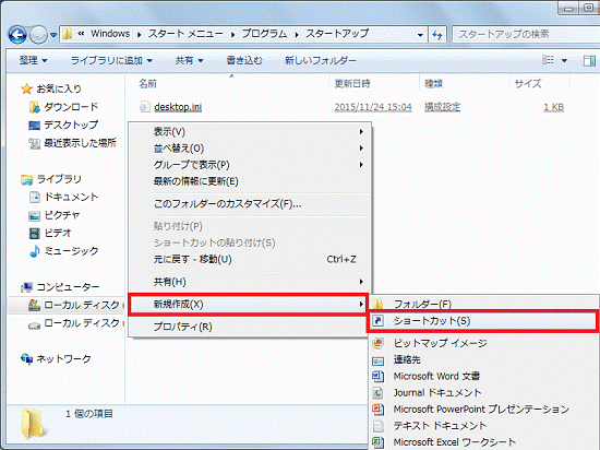 ウィンドウの何もないところを右クリックし、表示されるメニューから「新規作成」→「ショートカット」の順にクリックします。