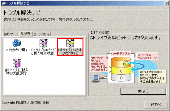 - 「Cドライブを64ビットにリカバリする」アイコンをクリックします。