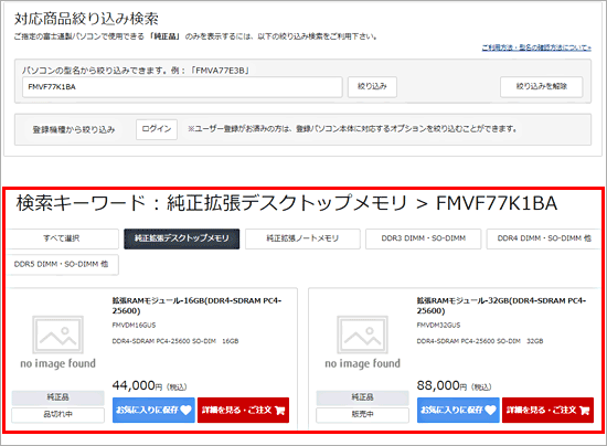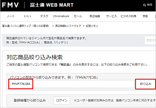 富士通 WEB MARTで、純正品のメモリの型名を確認する方法や購入する方法は、次のとおりです。