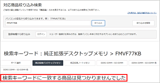 アドバイス - 「対象商品絞り込み検索」の下に、お使いの機種に対応しているメモリの、製品名や型名が表示されたことを確認します。