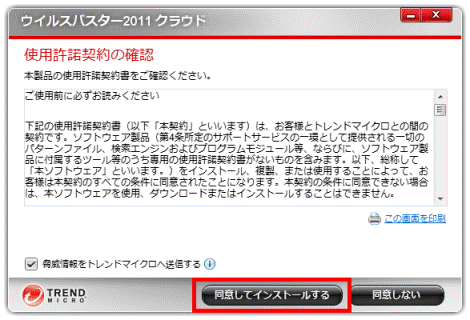 使用許諾契約書を確認し、同意する場合は、「同意してインストールする」ボタンをクリックします。