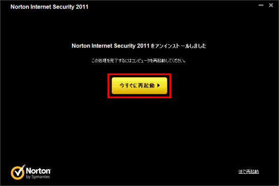 - 「Norton Internet Security 2011をアンインストールしました」または「Norton Internet Security 2011アンインストール済み」と表示されます。
